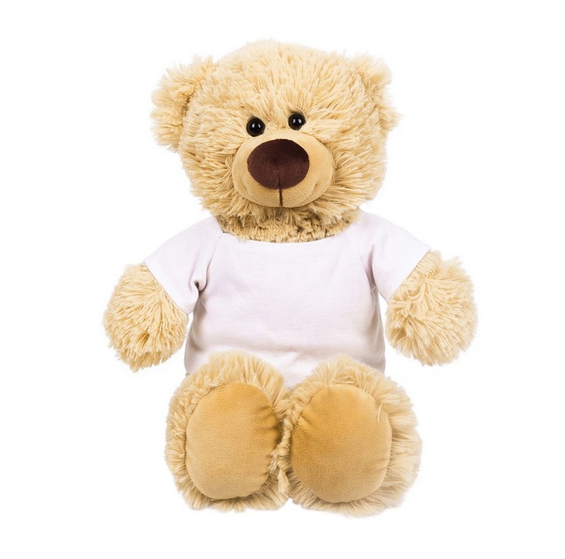 • Przytulanka ma założoną białą bluzkę z poliestru - ten element, dzięki obecności włókien poliestrowych, jest przystosowany do znakowania w technice sublimacji