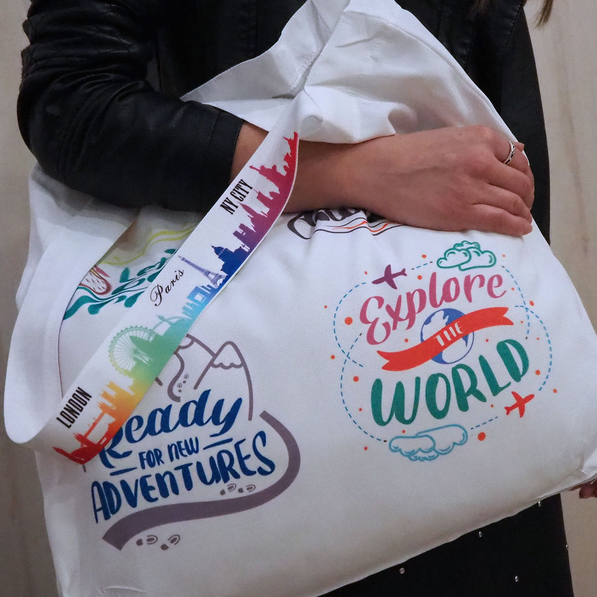 • Białe torby ekologiczne z własnym nadrukiem mogą być noszone pojedynczo lub razem z miejską torebką, by pomieścić wszelkie niezbędne przedmioty: drugie śniadanie do pracy i szkoły, książki na uczelnię, dziecięce zabawki i inne drobiazgi, które trzeba wygodnie przenieść