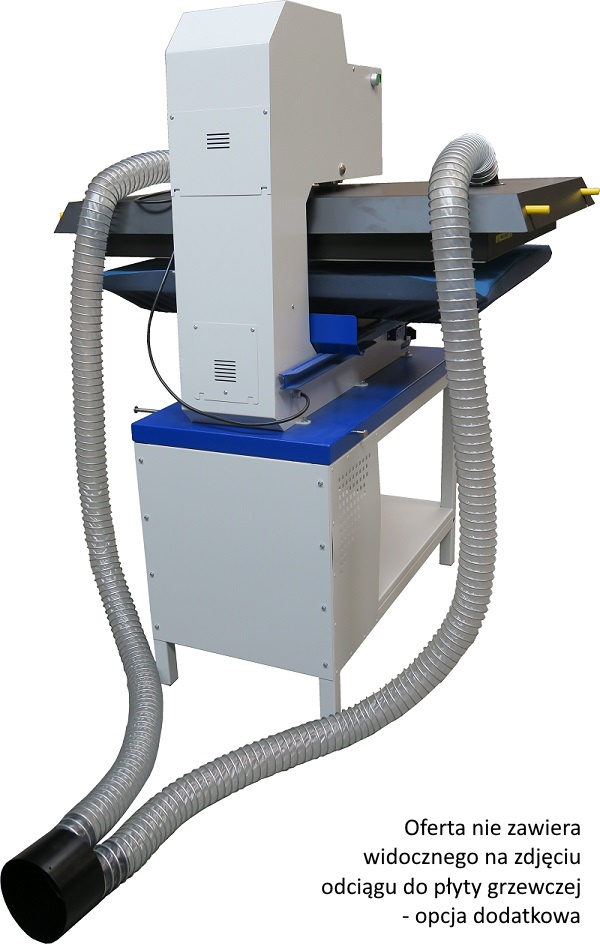 • Oferta nie zawiera widocznego na ostatnim zdjęciu odciągu do płyty grzewczej - opcja dodatkowa. Odciąg umożliwia odprowadzenie wydobywających się podczas wgrzewania oparów, chroniąc osobę wykonującą nadruk przed wdychaniem szkodliwych oparów. Odciąg podłącza się do instalacji wentylacyjnej.