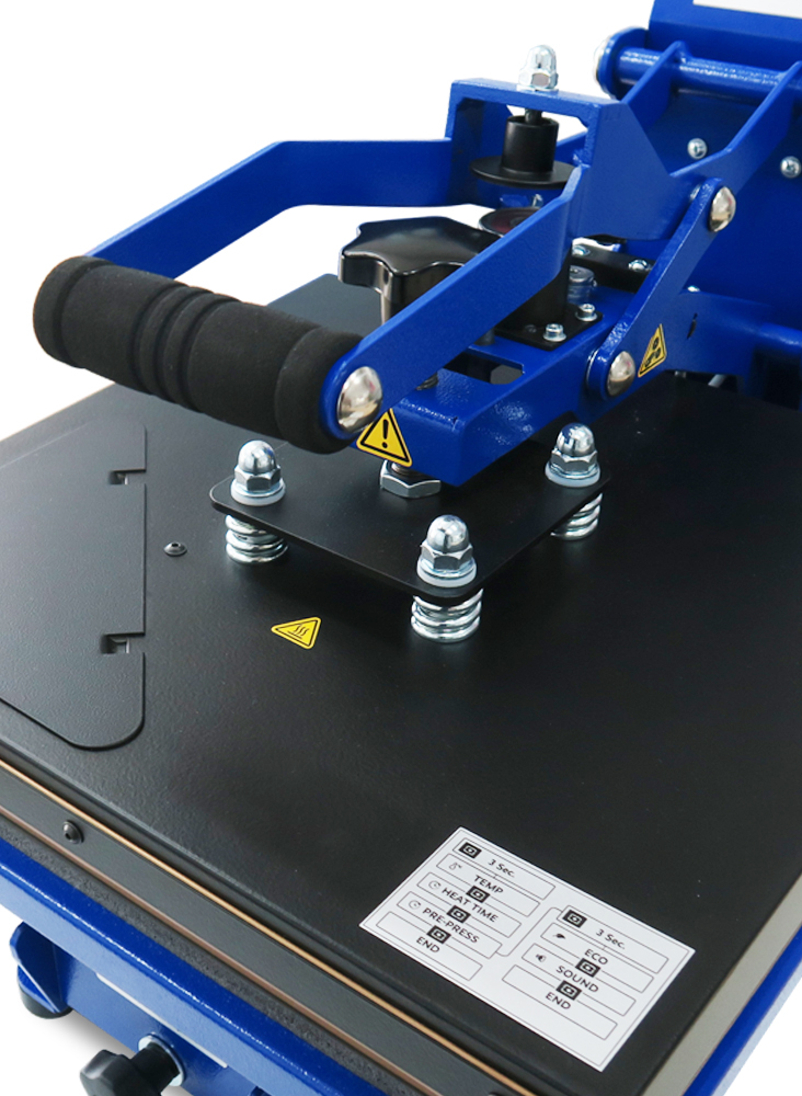 • Profesjonalna prasa sublimacyjna w kolorze niebieskim posiada funkcję przeprasowania oraz funkcję ECO - sterowaną automatycznie, w trzech trybach (prasa chłodzi się lub wyłącza po braku aktywności przez określony czas, co stanowi znaczną oszczędność energii):