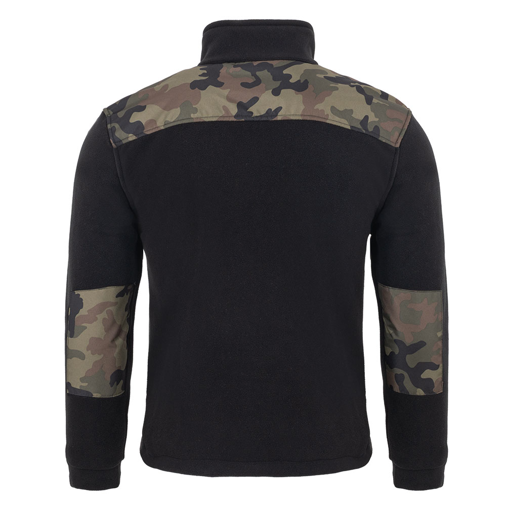 Rozpinana czarna bluza polarowa z wstawkami moro to świetny pomysł na uniwersalny strój zarówno na wieczorny spacer jak i w chłodne dni do pracy.