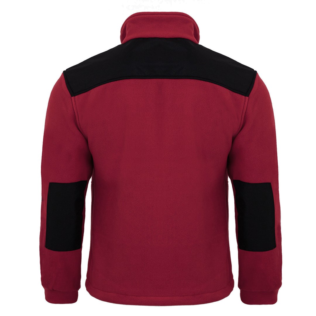 Rozpinana bordowa bluza polarowa z czarnymi, gładkimi wstawkami to świetny pomysł na uniwersalny strój zarówno na wieczorny spacer jak i w chłodne dni do pracy.