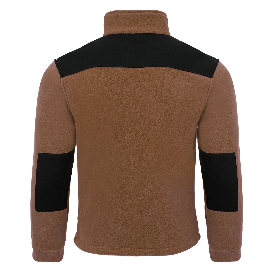 Rozpinana brązowa bluza polarowa z czarnymi, gładkimi wstawkami to świetny pomysł na uniwersalny strój zarówno na wieczorny spacer jak i w chłodne dni do pracy.
