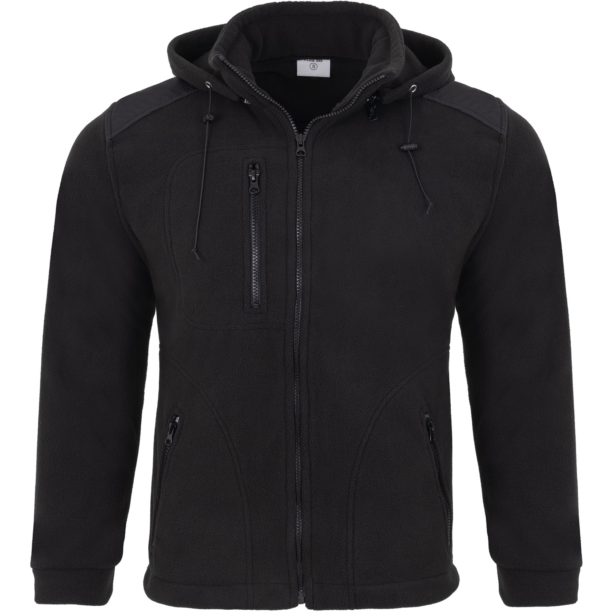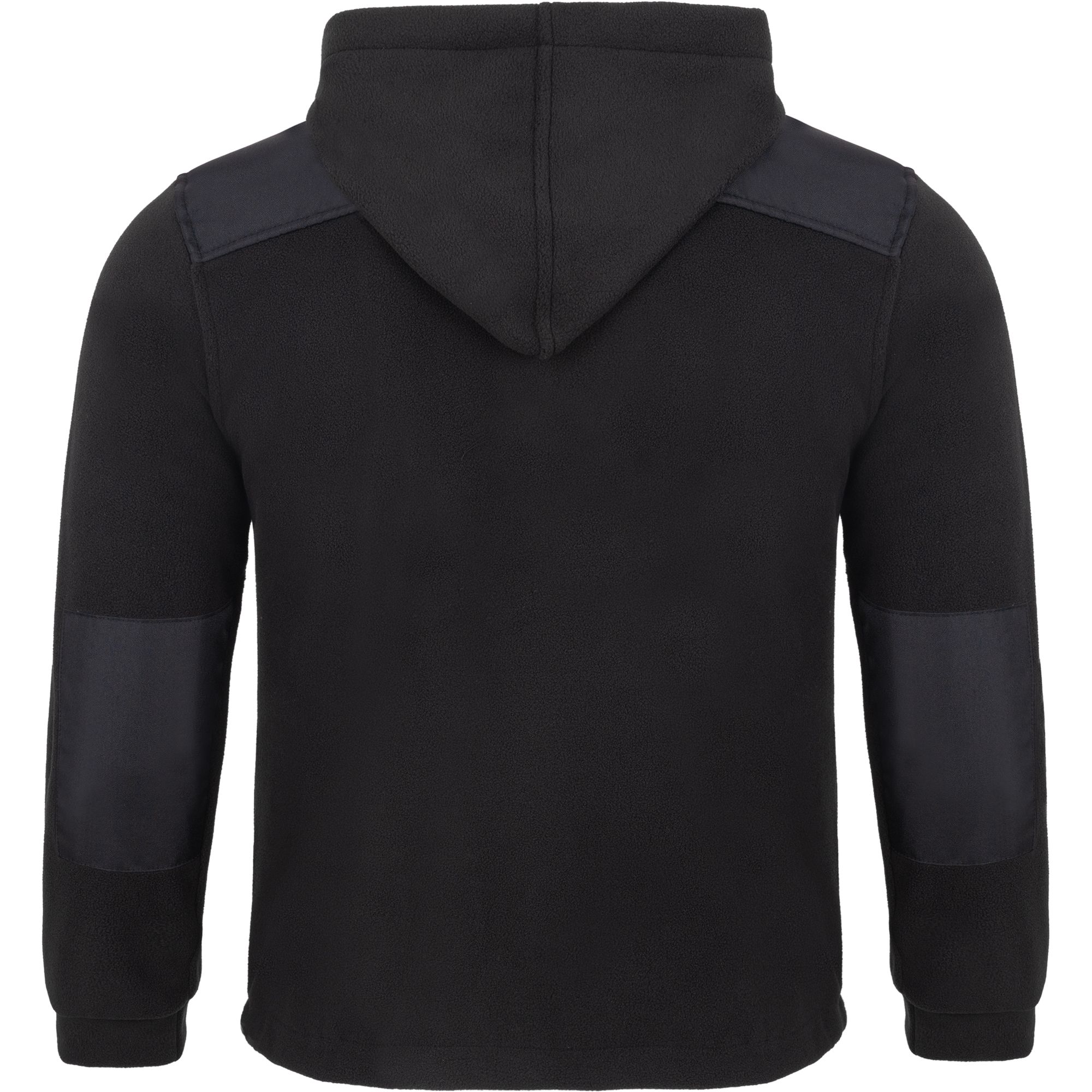 Rozpinana czarna bluza polarowa z kapturem i z czarnymi wstawkami to świetny pomysł na uniwersalny strój zarówno na wieczorny spacer jak i w chłodne dni do pracy.