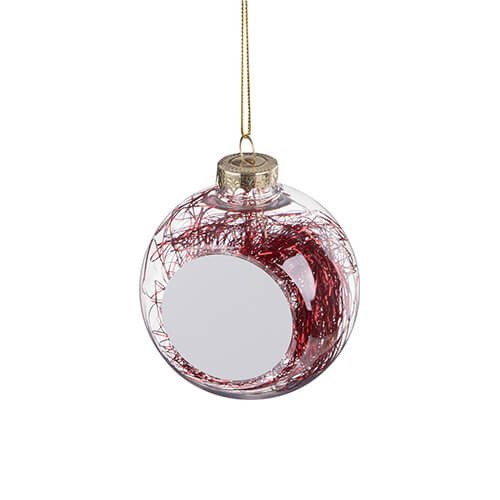 Przezroczysta bombka z czerwonymi włosami anielskimi w środku, z polem do sublimacji. Czerwone nitki (kłębek) nadają jej oryginalnego charakteru i sprawiają, że pasuje nawet do nowoczesnych wnętrz. Średnica bombki z wkładem: 80mm, pole nadruku: okrąg o średnicy 50mm.