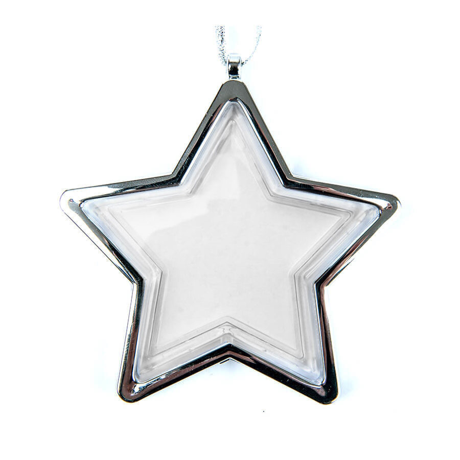 Przezroczysta bombka ze srebrną zawieszką w srebrnej ramce w kształcie gwiazdy, do samodzielnego montażu. Gwiazda jest przeznaczona do wypełnienia papierowym zdjęciem dociętym na wymiar. Rozmiar: 96 x 98 mm