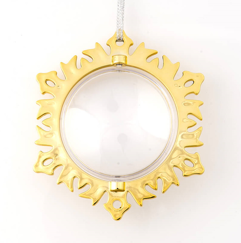 Przezroczysta bombka choinka ze srebrną zawieszką w złotej ramce w kształcie płatka, do samodzielnego montażu. Aby wypełnić bombkę zdjęciem pobierz szablon płatek śniegu do wyciecia. Wymiary: 90 mm x 103 mm x 28 mm