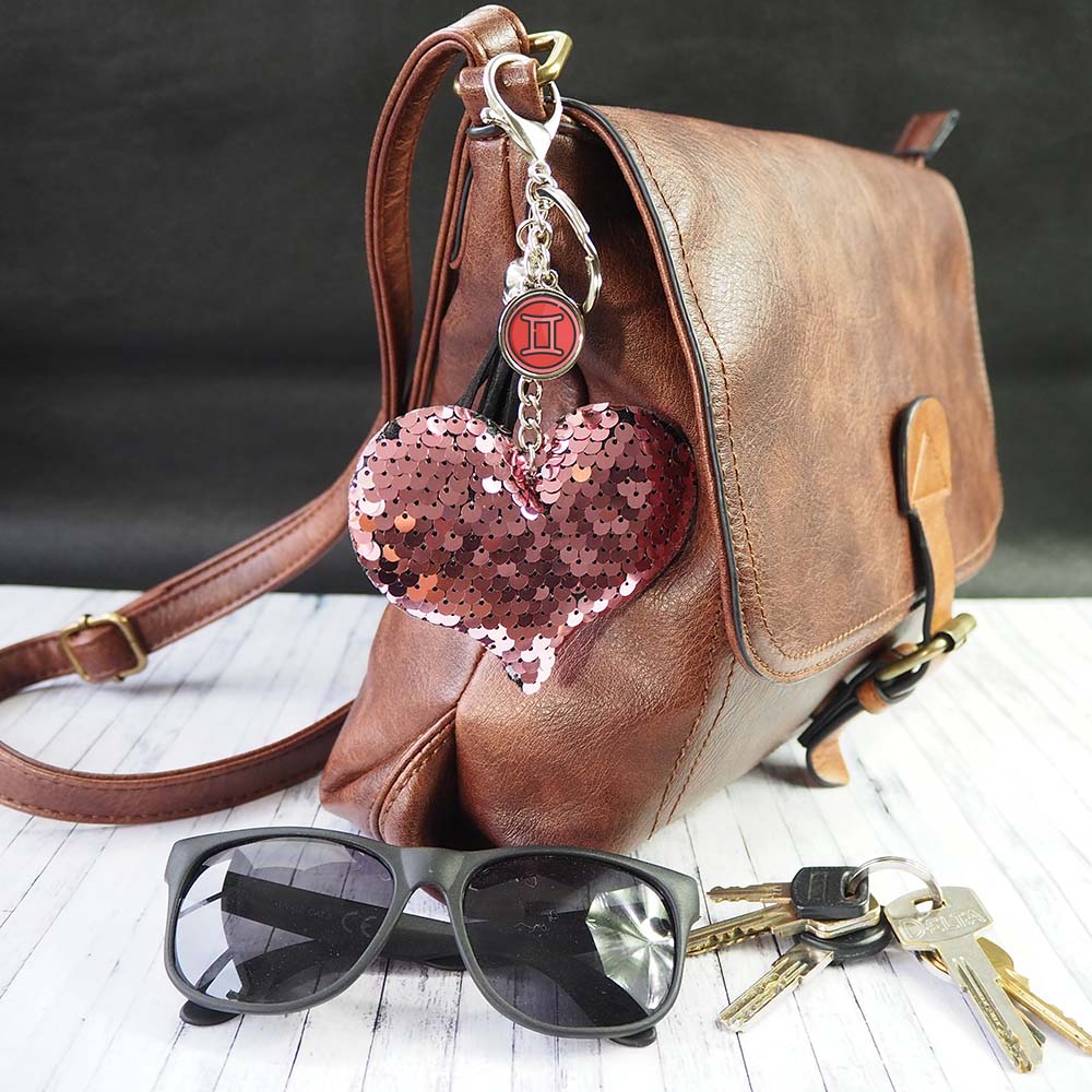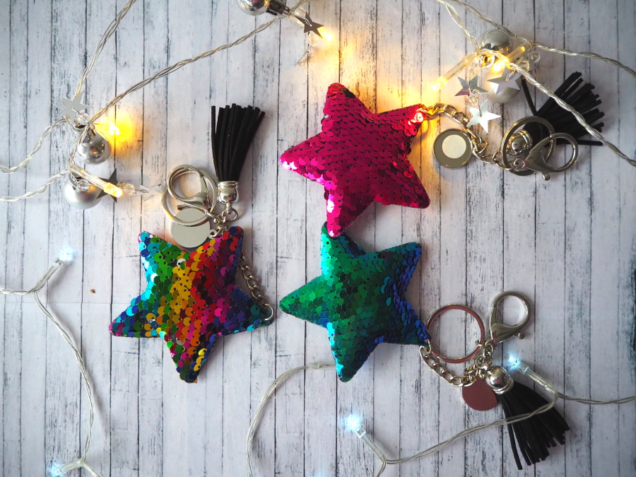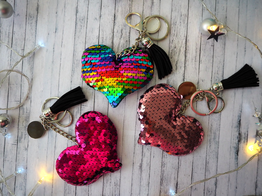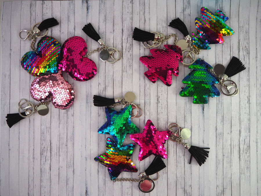 • Kolorowa przywieszka jest pokryta odwracalnymi, dwukolorowymi cekinami, a oprócz metalowej płytki pod nadruk, ma też dekoracyjne frędzle