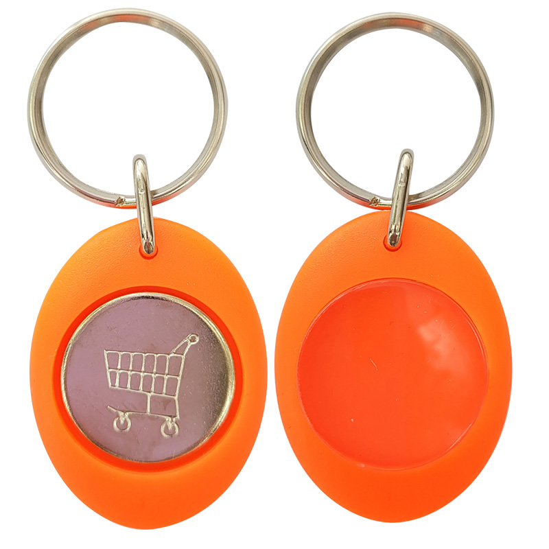 Pomarańczowy neonowy brelok na zdjęcie do samodzielnego wykonania z żetonem do wózków zakupowych