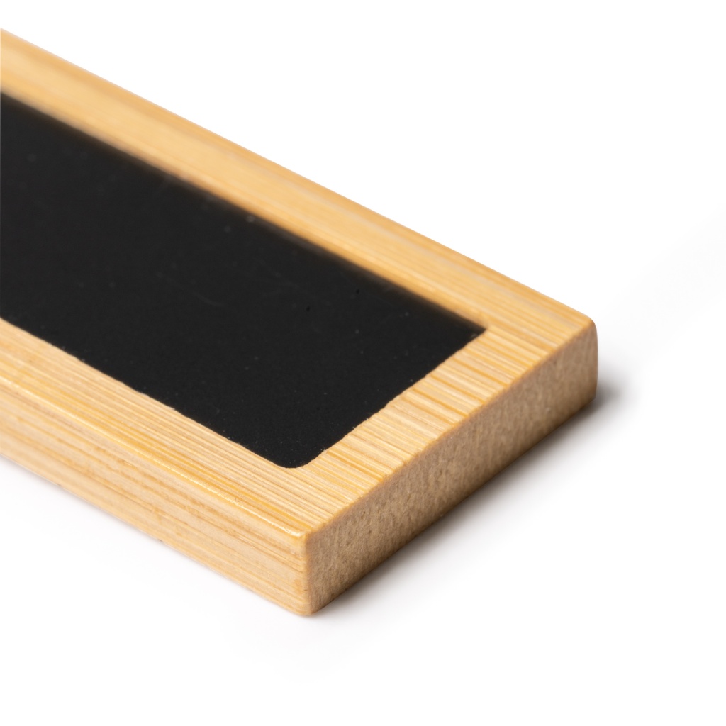 • Zawieszka do personalizacji jest wykonana z drewna bambusowego oraz metalowego, prostokątnego elementu w kolorze czarnym