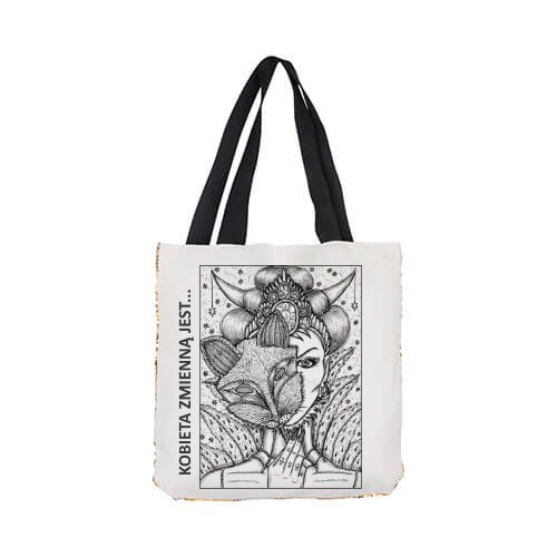 • Torba zakupowa do zadruku z wygodnymi uszami jest wykonana po jednej stronie z płótna poliestrowego, druga strona to dwustronne cekiny