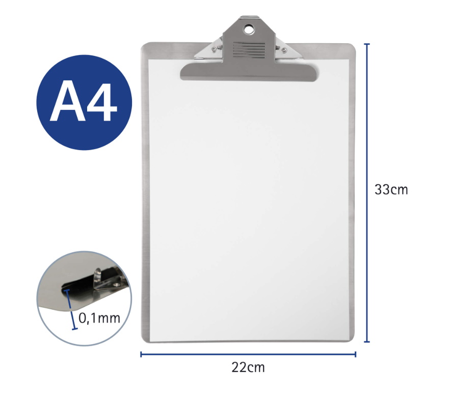 • Metalowy, pionowy clipboard z klipsem i zawieszką w formacie A4 o całkowitych wymiarach 33 x 22 x 3,5 cm