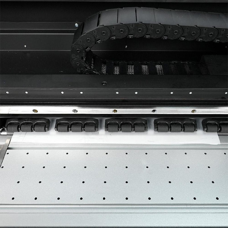 • Wbudowana platforma próżniowa: folia jest wchłaniana na płasko, co pozwala zachować jej wysokość podczas drukowania