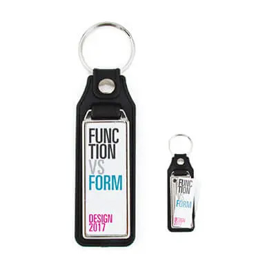 • jednostronny brelok metalowy z powierzchnią nadruku, połączony z podkładką wykonaną ze skóry syntetycznej
