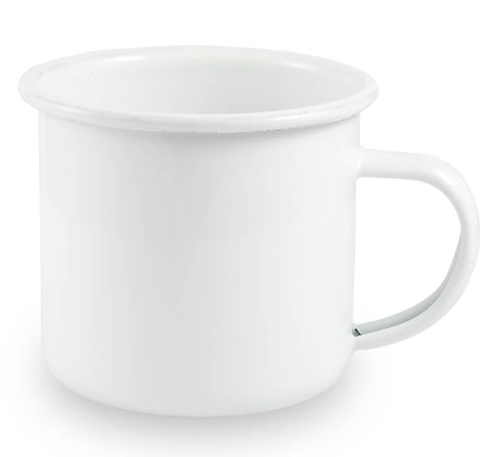 • Metalowy, emaliowany kubek do sublimacji w kolorze białym z białą krawędzią