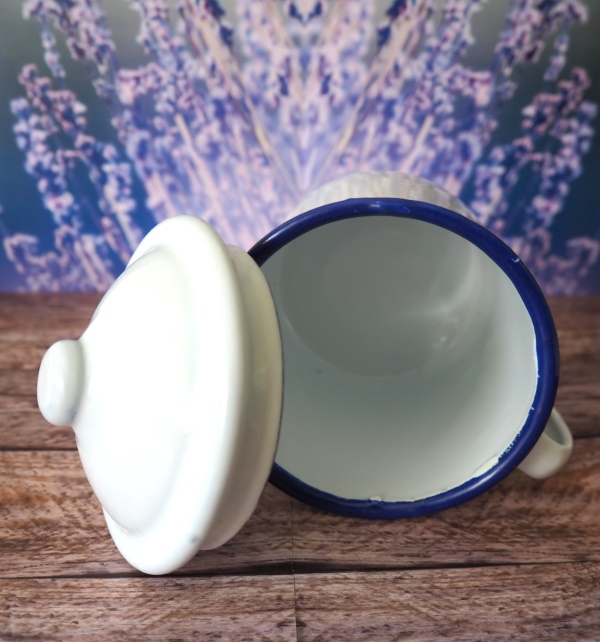 • Metalowy, emaliowany kubek do sublimacji w kolorze białym z granatową krawędzią i metalową, białą pokrywką