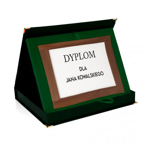 • Metalowy dyplom na drewnianym podkładzie w etui można postawić na półce lub innym honorowym miejscu