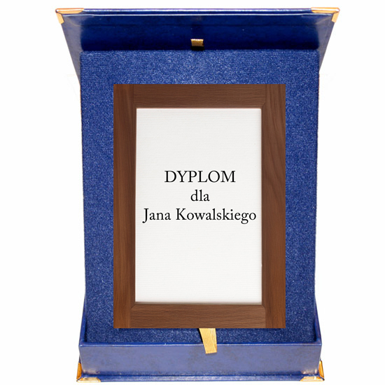 • Metalowy dyplom na drewnianym podkładzie w etui można postawić na półce lub innym honorowym miejscu