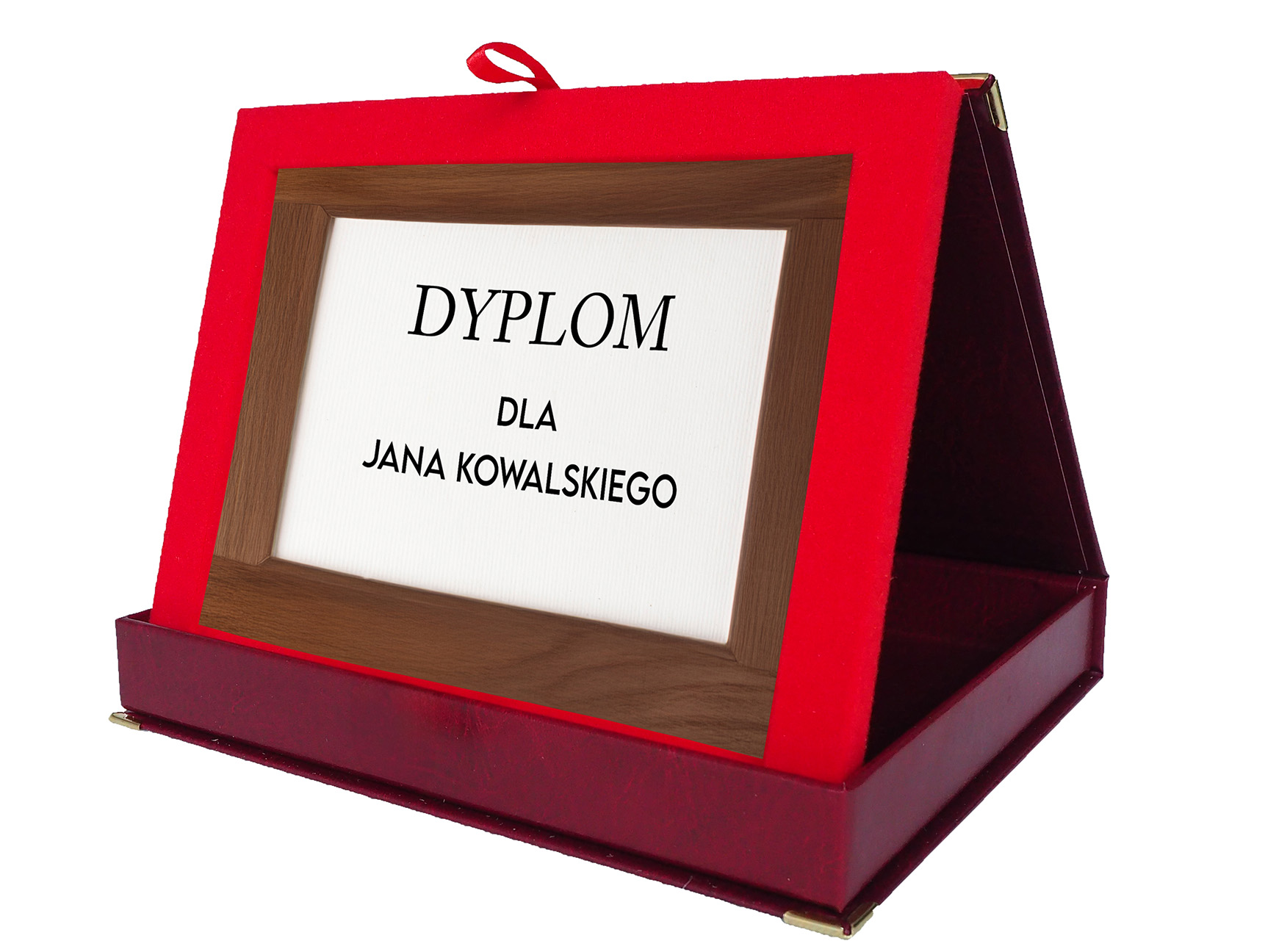 • Metalowy dyplom na drewnianym podkładzie w etui można postawić na półce lub innym honorowym miejscu