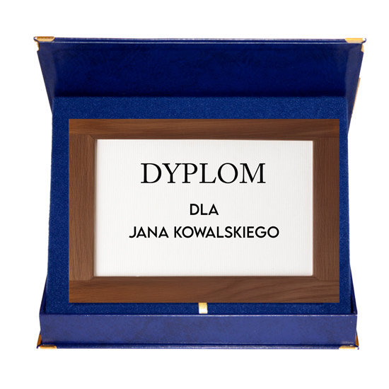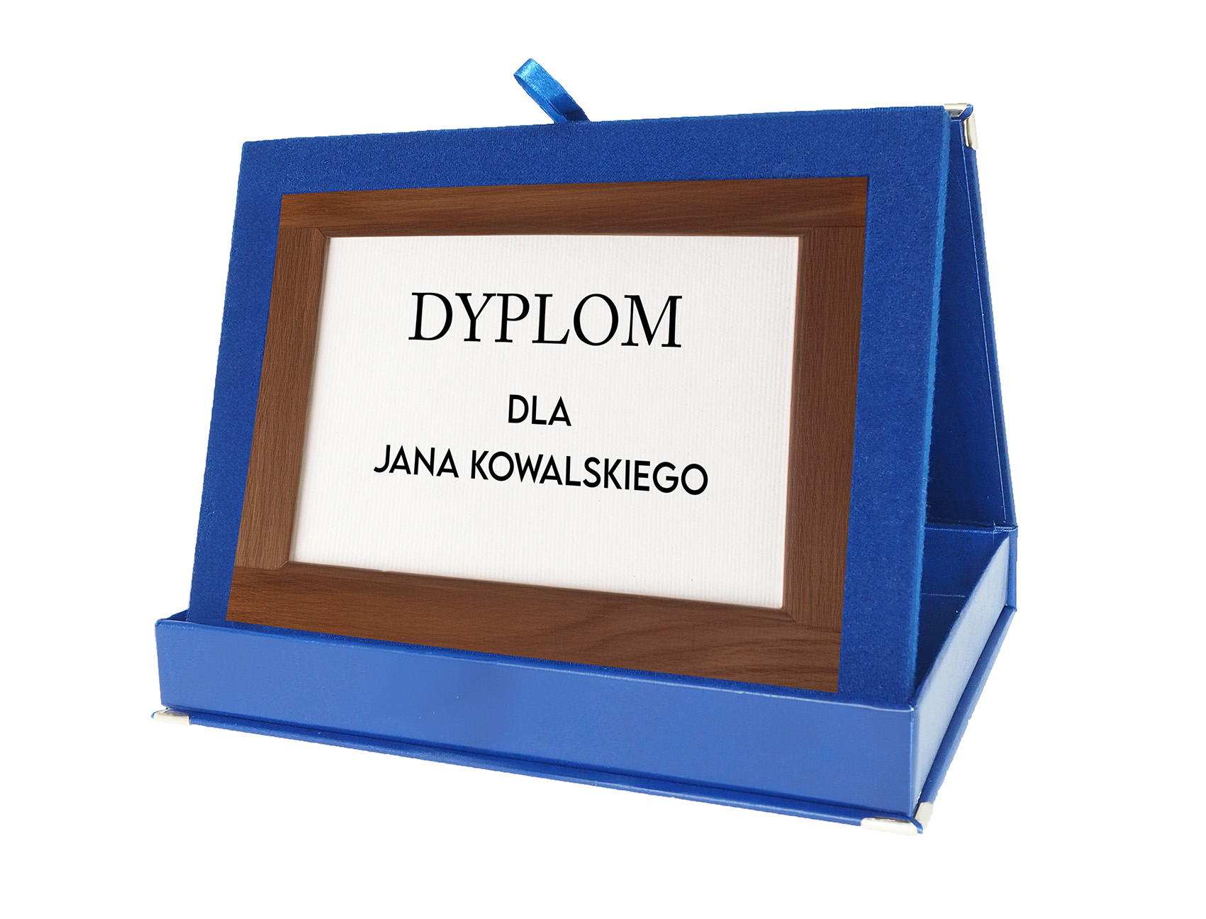 • Metalowy dyplom na drewnianym podkładzie w etui można postawić na półce lub innym honorowym miejscu