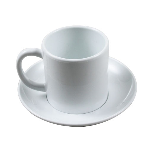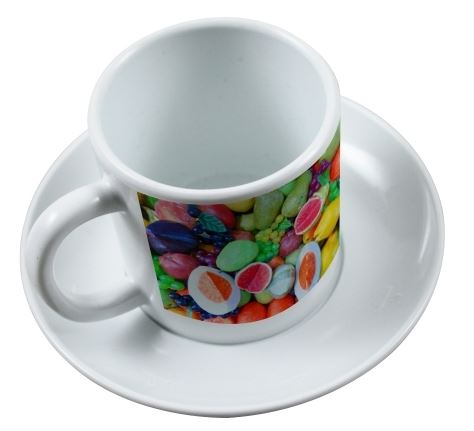 • Plastikowa, biała filiżanka kawowa do nadruku metodą sublimacji i grawerowania laserowego