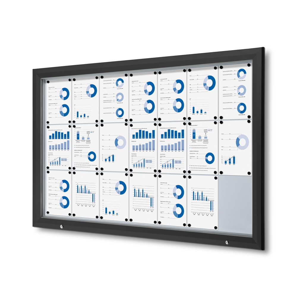 Gabloty zewnętrzne to najlepszy sposób na prezentację treści poza budynkiem. Stojące czy wiszące gabloty przedstawiają informacje dla przechodniów czy potencjalnych klientów: cennik, rozkład jazdy, ogłoszenia, plan zajęć. Aluminiowe witryny z ogłoszeniami wypierają witryny drewniane ze względu na nowoczesny design i trwałość. Dzięki swojej uniwersalności gablotki reklamowe i informacyjne doskonale sprawdzają się w każdym miejscu: przed urzędem, biurem, szkołą, kościołem, firmą czy klatką schodową.