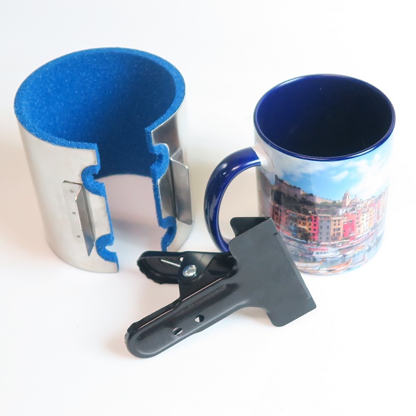 • Praska do kubków wyróżnia się możliwością zadruku kubka dookoła - obejma została tak zaprojektowana, by móc transferować obrazy również w okolicach ucha