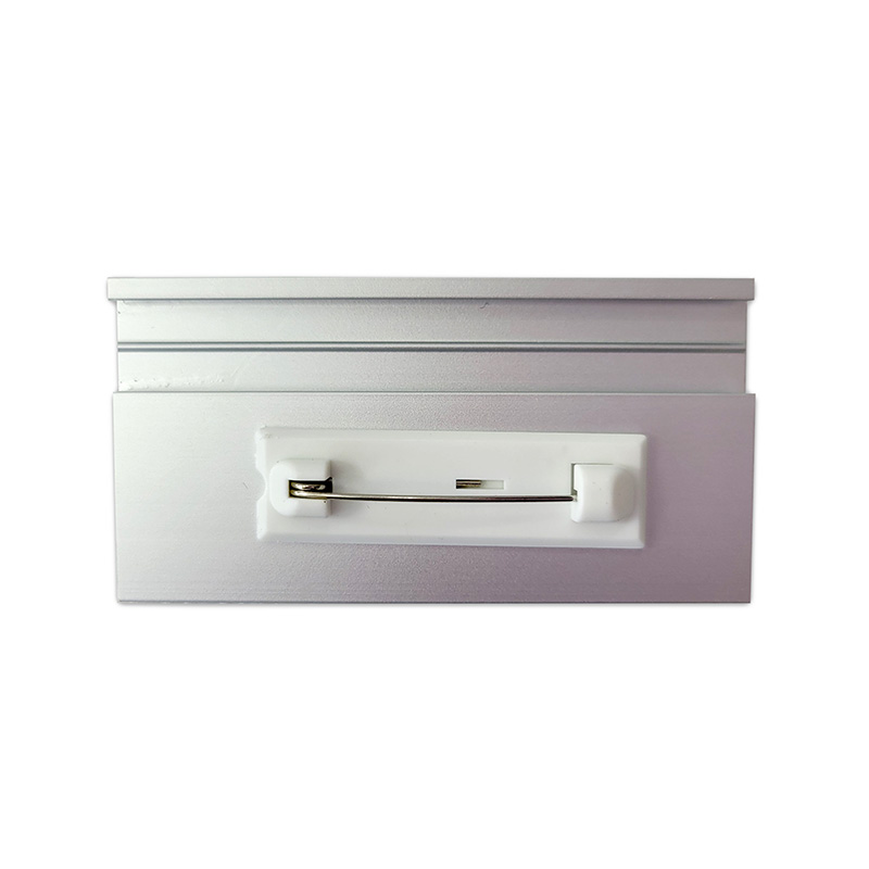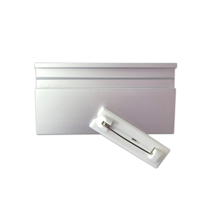 Elegancki i funkcjonalny identyfikator wielokrotnego użytku wykonany z wytrzymałego srebrnego aluminium, zapinany na agrafkę.
