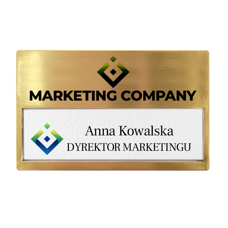 Elegancki i funkcjonalny identyfikator wielokrotnego użytku wykonany z tworzywa sztucznego z zapięciem na magnes. Przód identyfikatora jest wykończony złotym aluminium.