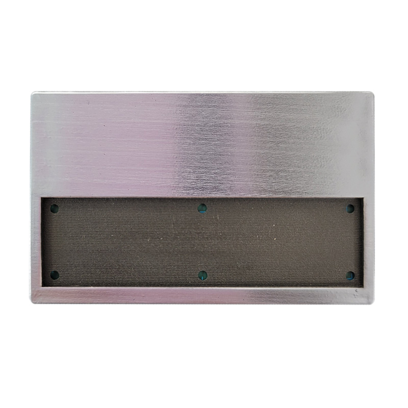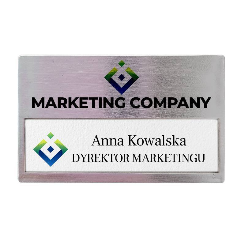 Elegancki i funkcjonalny identyfikator wielokrotnego użytku wykonany z tworzywa sztucznego z zapięciem na magnes. Przód identyfikatora jest wykończony srebrnym aluminium.