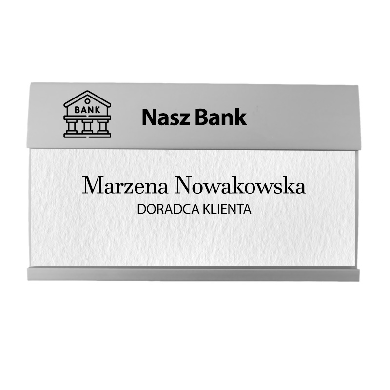 Elegancki i funkcjonalny identyfikator wielokrotnego użytku wykonany z wytrzymałego srebrnego aluminium z zapięciem typu zawieszka na agrafkę.
