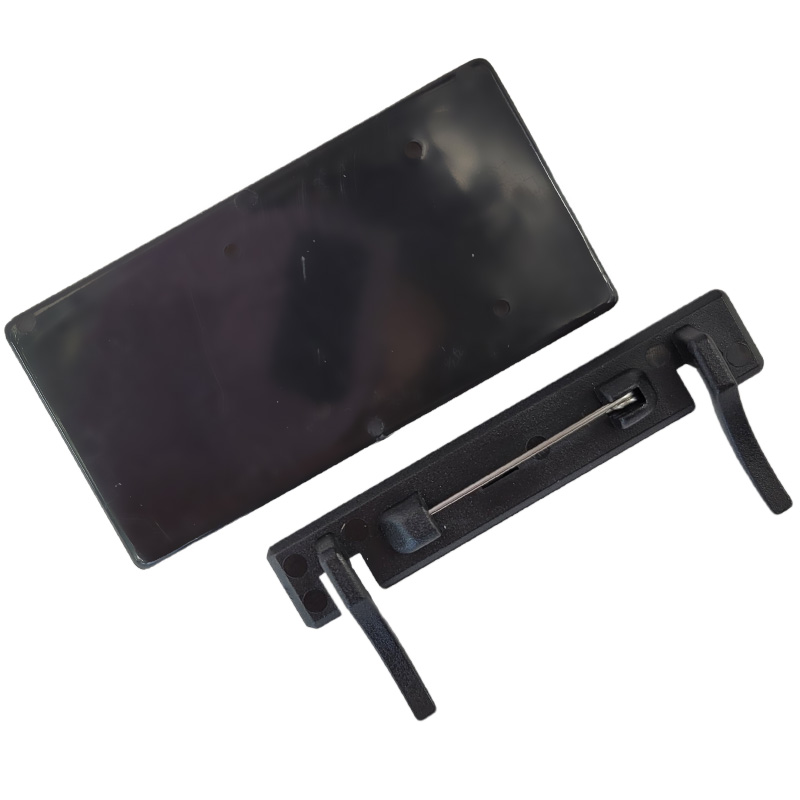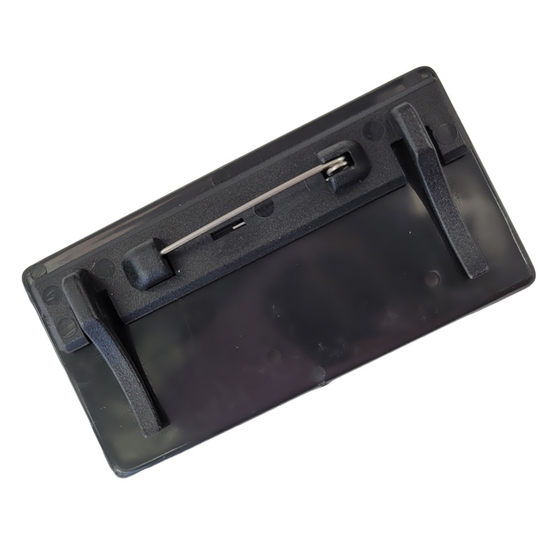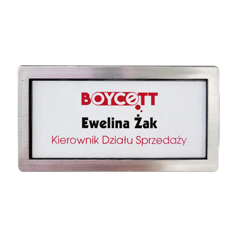 Elegancki i funkcjonalny identyfikator wielokrotnego użytku wykonany z tworzywa sztucznego z zapięciem typu zawieszka na agrafkę. Przód identyfikatora jest wykończony srebrnym aluminium.