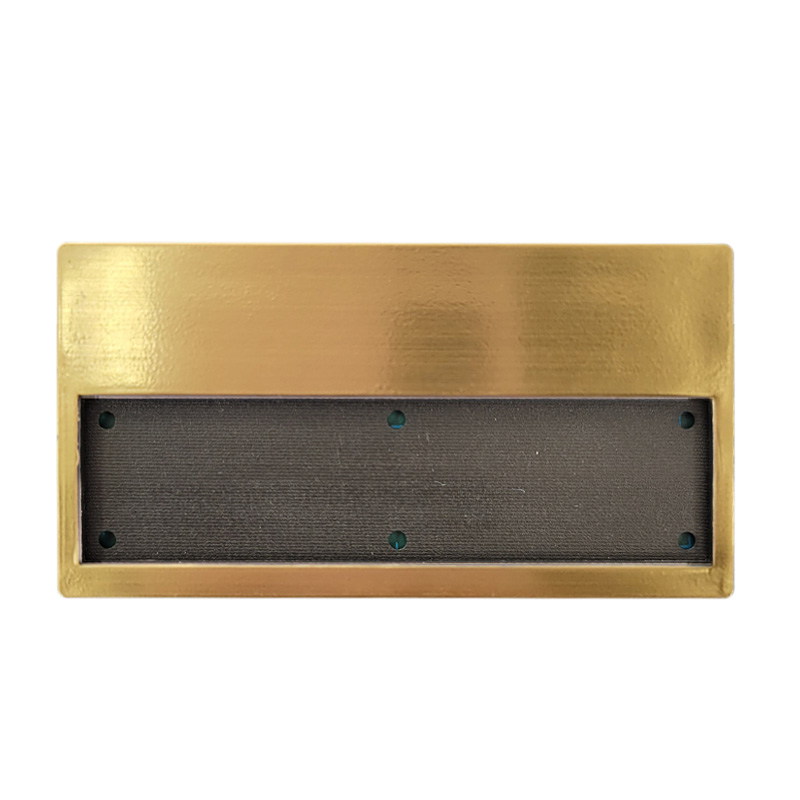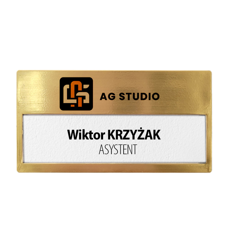 Elegancki i funkcjonalny identyfikator wielokrotnego użytku wykonany z tworzywa sztucznego z zapięciem na magnes. Przód identyfikatora jest wykończony złotym aluminium.