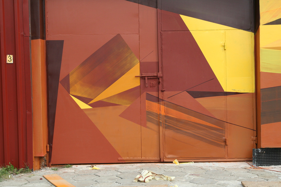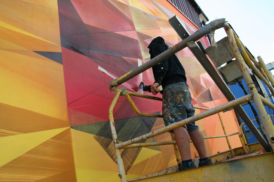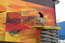 Zdjęcia prezentujące wykonanie muralu na fasadzie AGAWA.PL Sp. z o.o. przez Bartka Świąteckiego: