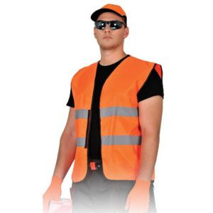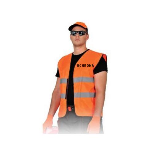 • Kamizelka ostrzegawcza (fluorescencyjna) pod zadruk w dolnej części posiada dwa poziome odblaskowe pasy,dobrze widoczne z dużej odległości; kamizelka jest zapinana na rzepy