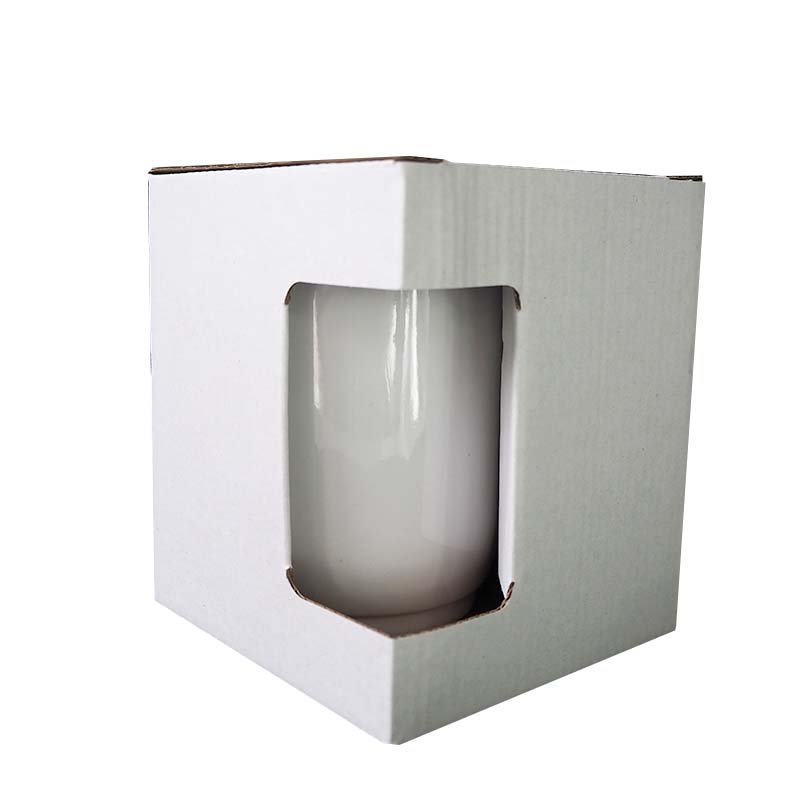 • Karton na kubki porcelanowe posiada okienko, eksponujące gotowy nadruk na kubeczku