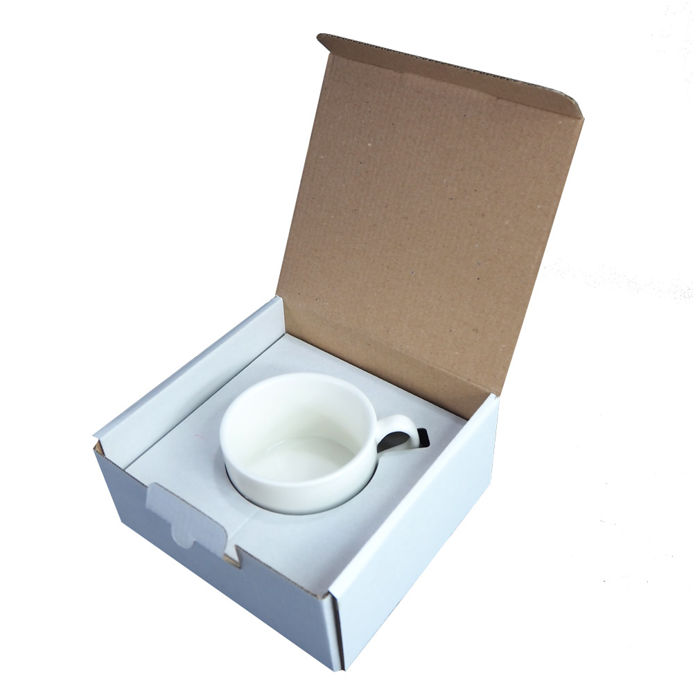 • Opakowanie kartonowe do filiżanki jest wykonane z wytrzymałej tektury prążkowanej (mikrofala) jednostronnie białej, matowej, środek kartonika w naturalnym kolorze szarej tektury