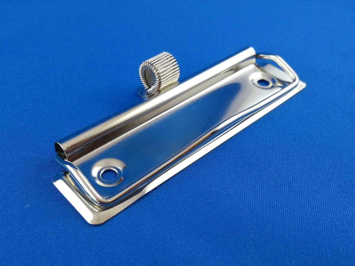 • Srebrny wykonany z niklowanego metalu klips o długości 10 cm z uchwytem na długopis, do zamontowania do metalu, drewna, tworzyw sztucznych (podkładki, deski, clipboardy, ściany, tablice itp.)