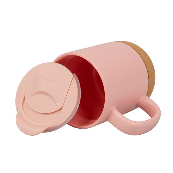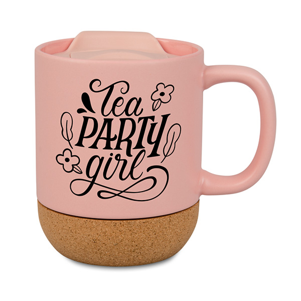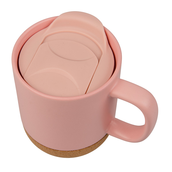 Pastelowy, jasno-różowy kubek reklamowy do sublimacji z korkową podstawką