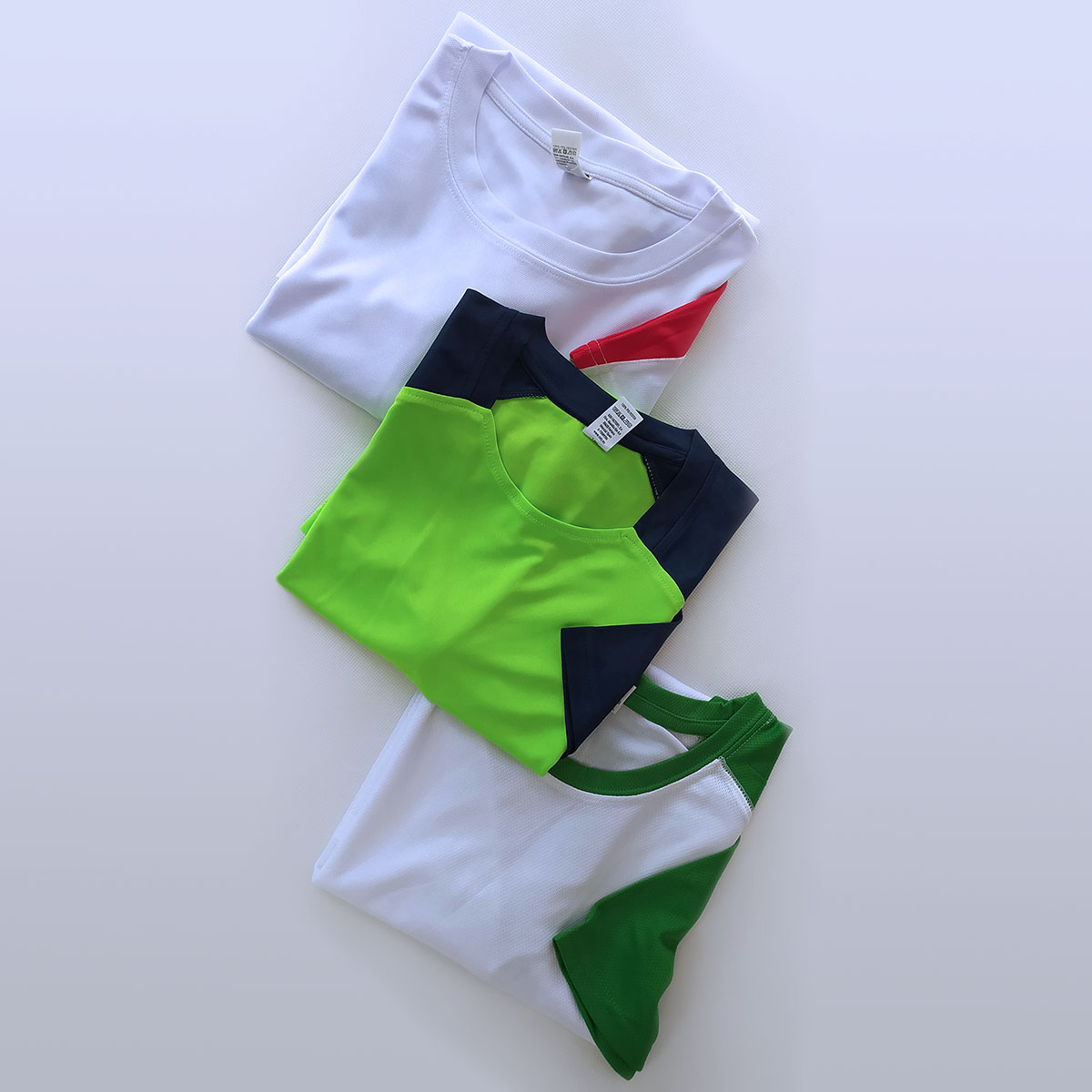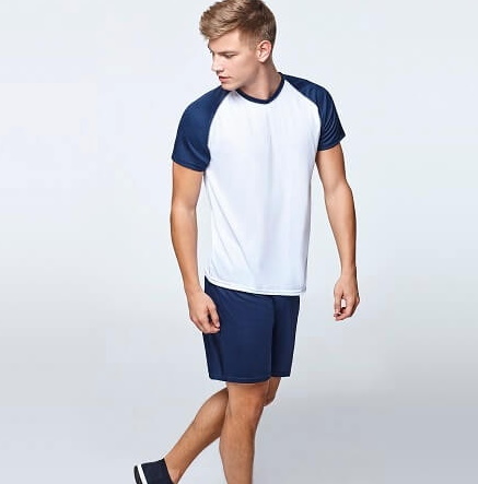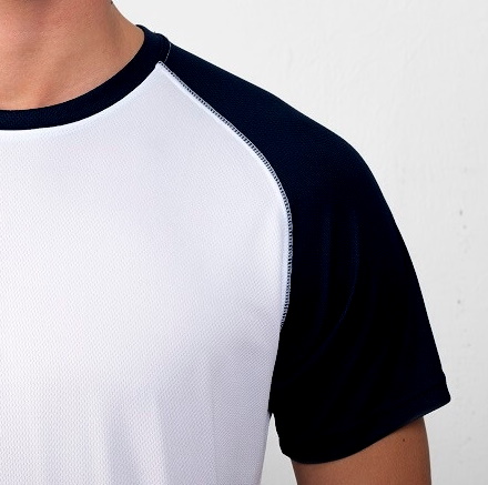 • Koszulka sportowa ma krótki, reglanowy rękaw w kontrastowym kolorze oraz okrągły, kolorowy dekolt ze wzmocnionymi, krytymi szwami