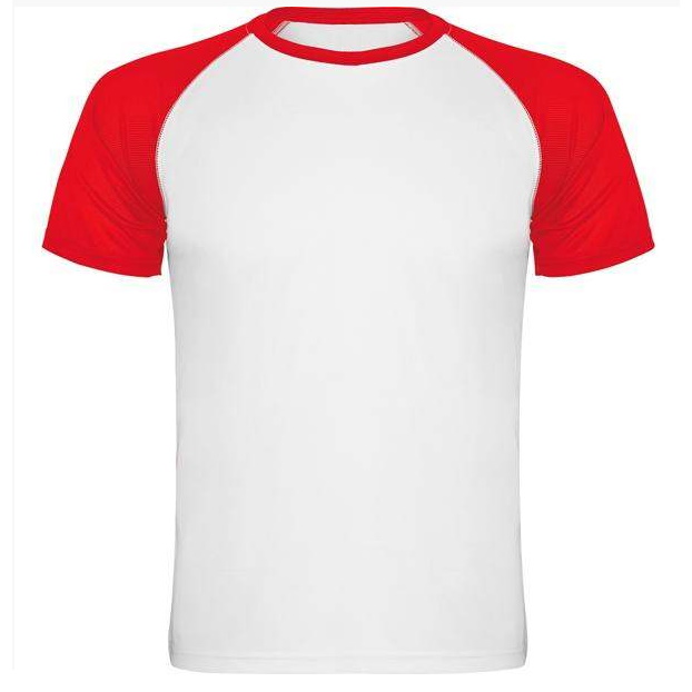 • Koszulka sportowa ma krótki, reglanowy rękaw w kontrastowym kolorze oraz okrągły, kolorowy dekolt ze wzmocnionymi, krytymi szwami
