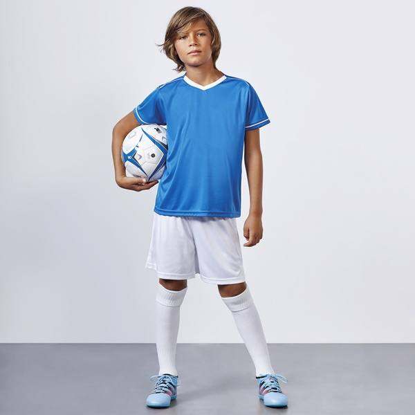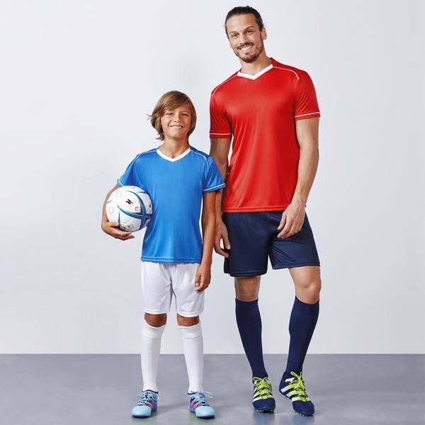 • Sportowy zestaw prezentuje się estetycznie, ma nowoczesny ponadczasowy wzór. Świetnie sprawdzi się dla drużyn piłkarskich dziecięcych i młodzieżowych
