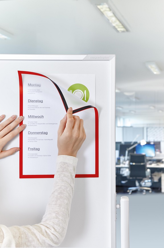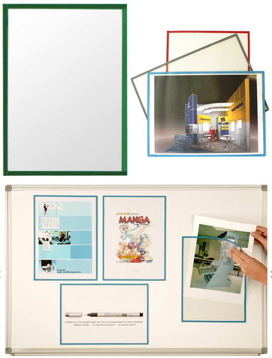 Ramki magnetyczne na dokumenty składają się z grubej, transparentnej folii z kolorowym obwodem, która od spodniej części ma przymocowane magnesy. Wystarczy umieścić koszulkę magnetyczną na dowolnym metalowym podłożu, a następnie delikatnie ją odchylić i wsunąć plakat lub ogłoszenie. Matowa przezroczysta folia, oprócz podtrzymywania arkusza, pełni też funkcję ochronną - zabezpiecza umieszczony dokument przez zabrudzeniem. W odróżnieniu od niepraktycznych ramek samoprzylepnych, magnetyczne kieszenie można wielokrotnie usuwać i przytwierdzać na nowe miejsce, pozostawiając przedmiot w nienaruszonym stanie.