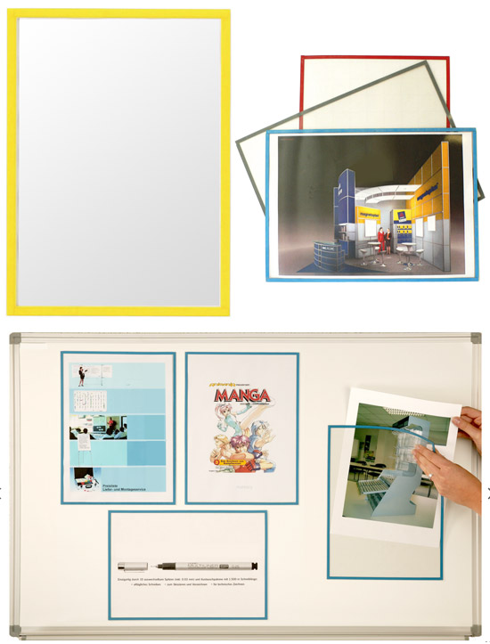Ramki magnetyczne na dokumenty składają się z grubej, transparentnej folii z kolorowym obwodem, która od spodniej części ma przymocowane magnesy. Wystarczy umieścić koszulkę magnetyczną na dowolnym metalowym podłożu, a następnie delikatnie ją odchylić i wsunąć plakat lub ogłoszenie. Matowa przezroczysta folia, oprócz podtrzymywania arkusza, pełni też funkcję ochronną - zabezpiecza umieszczony dokument przed zabrudzeniem. W odróżnieniu od niepraktycznych ramek samoprzylepnych, magnetyczne kieszenie można wielokrotnie usuwać i przytwierdzać na nowe miejsce, pozostawiając przedmiot w nienaruszonym stanie.