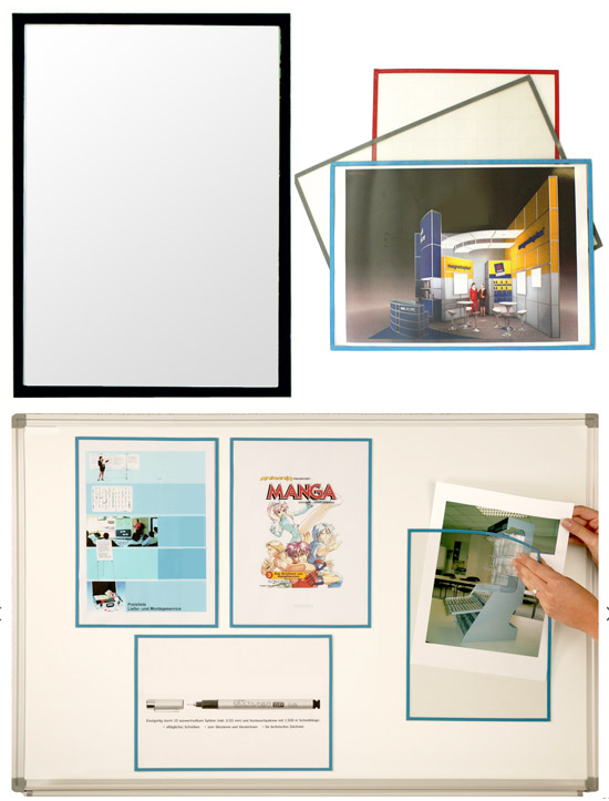 Ramki magnetyczne na dokumenty składają się z grubej, transparentnej folii z kolorowym obwodem, która od spodniej części ma przymocowane magnesy. Wystarczy umieścić koszulkę magnetyczną na dowolnym metalowym podłożu, a następnie delikatnie ją odchylić i wsunąć plakat lub ogłoszenie. Matowa przezroczysta folia, oprócz podtrzymywania arkusza, pełni też funkcję ochronną - zabezpiecza umieszczony dokument przed zabrudzeniem. W odróżnieniu od niepraktycznych ramek samoprzylepnych, magnetyczne kieszenie można wielokrotnie usuwać i przytwierdzać na nowe miejsce, pozostawiając przedmiot w nienaruszonym stanie.
