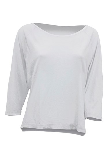 • Damska bluzka pod nadruk ma lekko rozszerzane rękawy (reglanowe) i szeroki, okrągły dekolt.