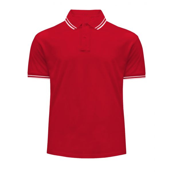 Męska koszulka Polo w kolorze czerwonym z krótkim rękawem i kołnierzykiem wykończonym ozdobnym ściągaczem w białe paski. Elegancki fason polówki dedykowany na pola golfowe, mecze tenisowe, nieoficjanle spotkania towarzyskie.