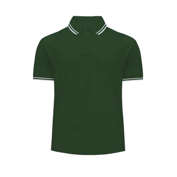 Męska koszulka Polo w kolorze zielonym z krótkim rękawem i kołnierzykiem wykończonym ozdobnym ściągaczem w białe paski. Elegancki fason polówki dedykowany na pola golfowe, mecze tenisowe, nieoficjanle spotkania towarzyskie.
