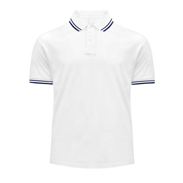 Męska koszulka Polo z krótkim rękawem i kołnierzykiem wykończonym ozdobnym ściągaczem w granatowe paski. Elegancki fason polówki dedykowany na pola golfowe, mecze tenisowe, nieoficjanle spotkania towarzyskie.