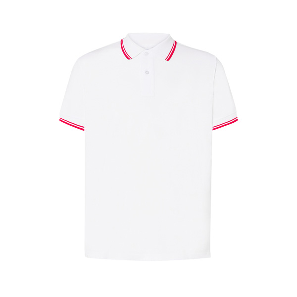 Męska koszulka Polo z krótkim rękawem i kołnierzykiem wykończonym ozdobnym ściągaczem w czerwone paski. Elegancki fason polówki dedykowany na pola golfowe, mecze tenisowe, nieoficjanle spotkania towarzyskie.